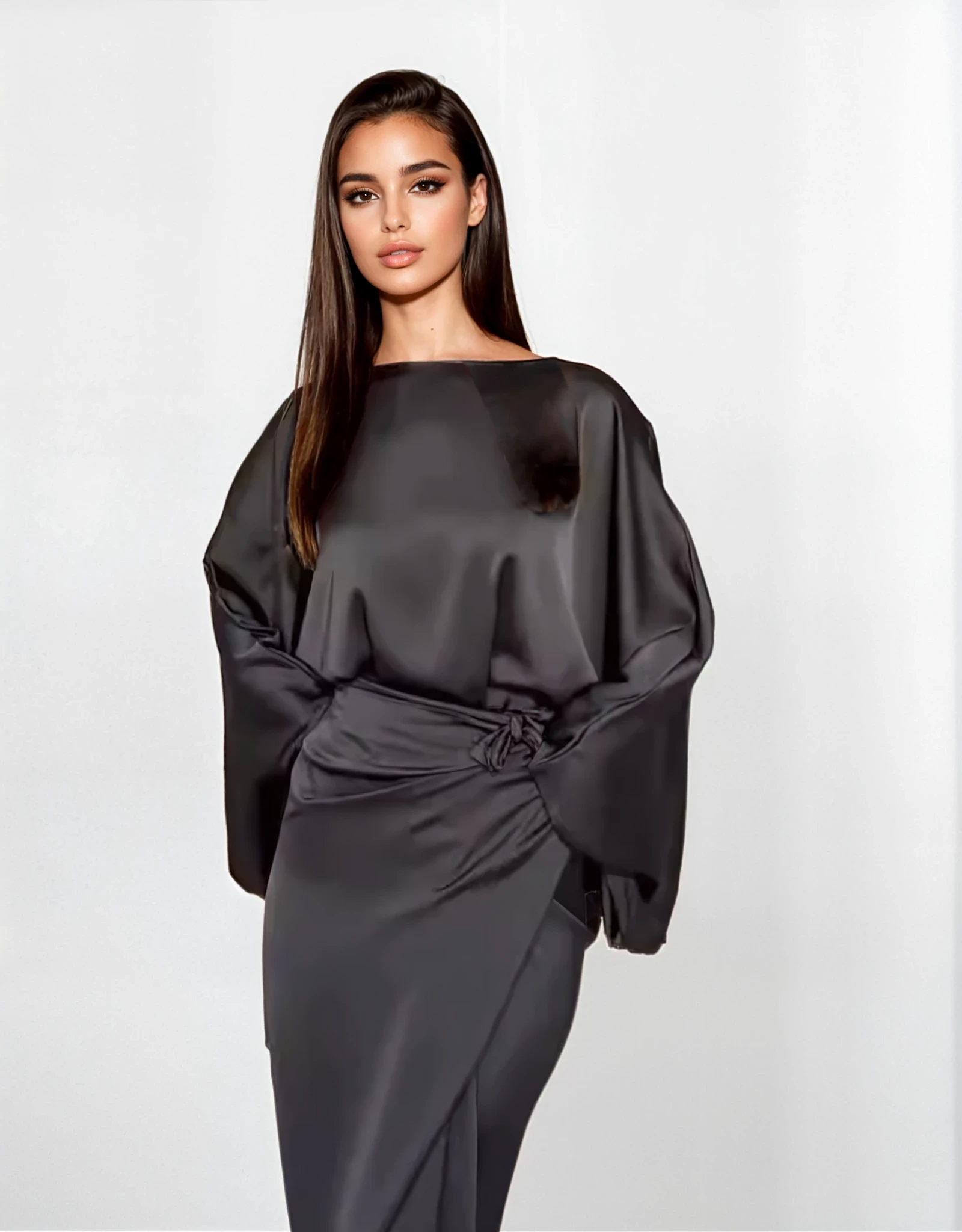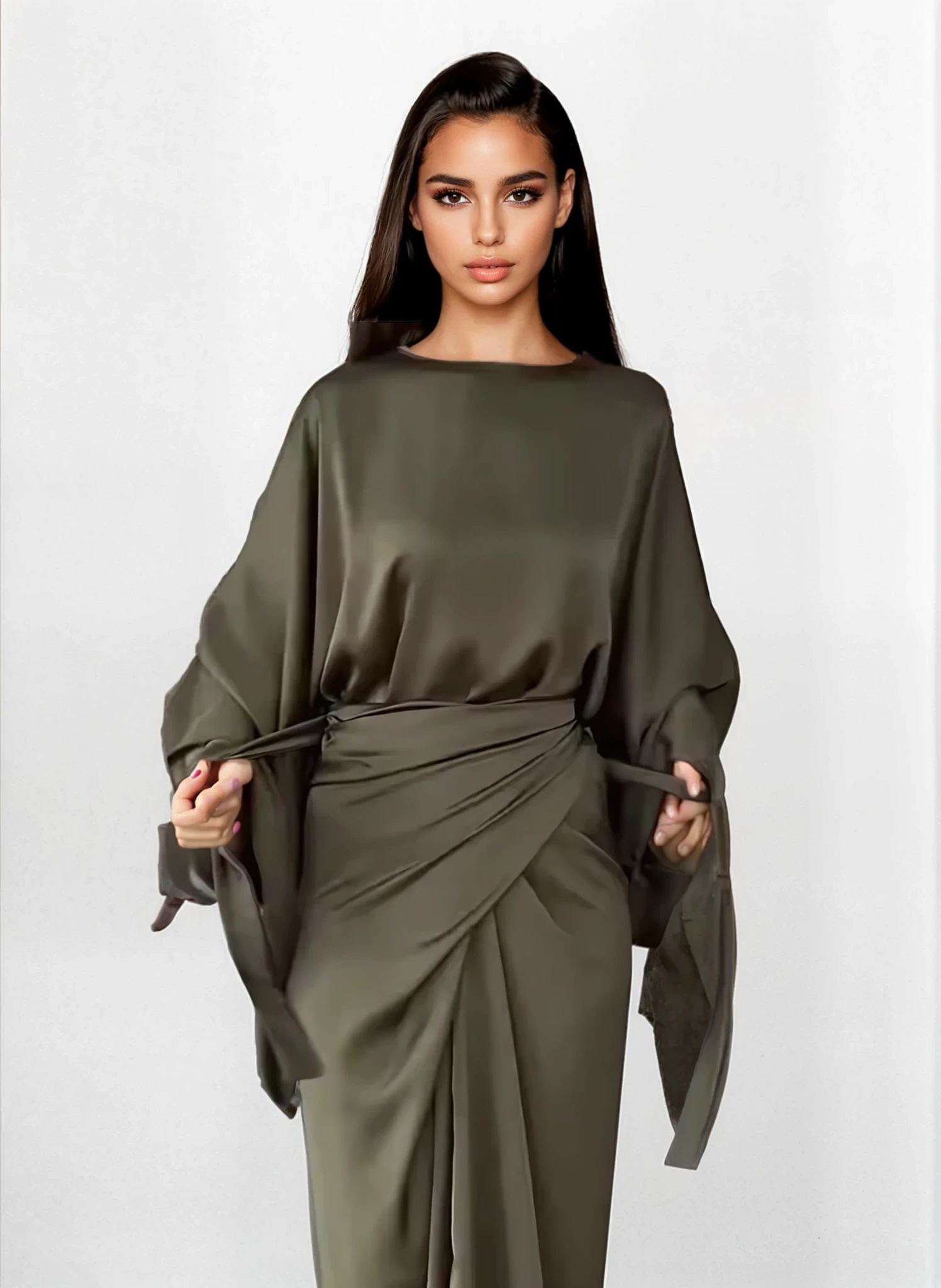 Omfamna förhöjd enkelhet med denna casual festklänning med fladdermusärmar och snörning , designad för moderna kvinnor som älskar elegant komfort och tidlös minimalism. Med mjuka fladdermusärmar, en smickrande snörning i midjan och en vackert draperad silhuett, erbjuder denna höstklänning i satin en enkel och elegant look för fester, middagar, evenemang och eleganta vardagsstunder.