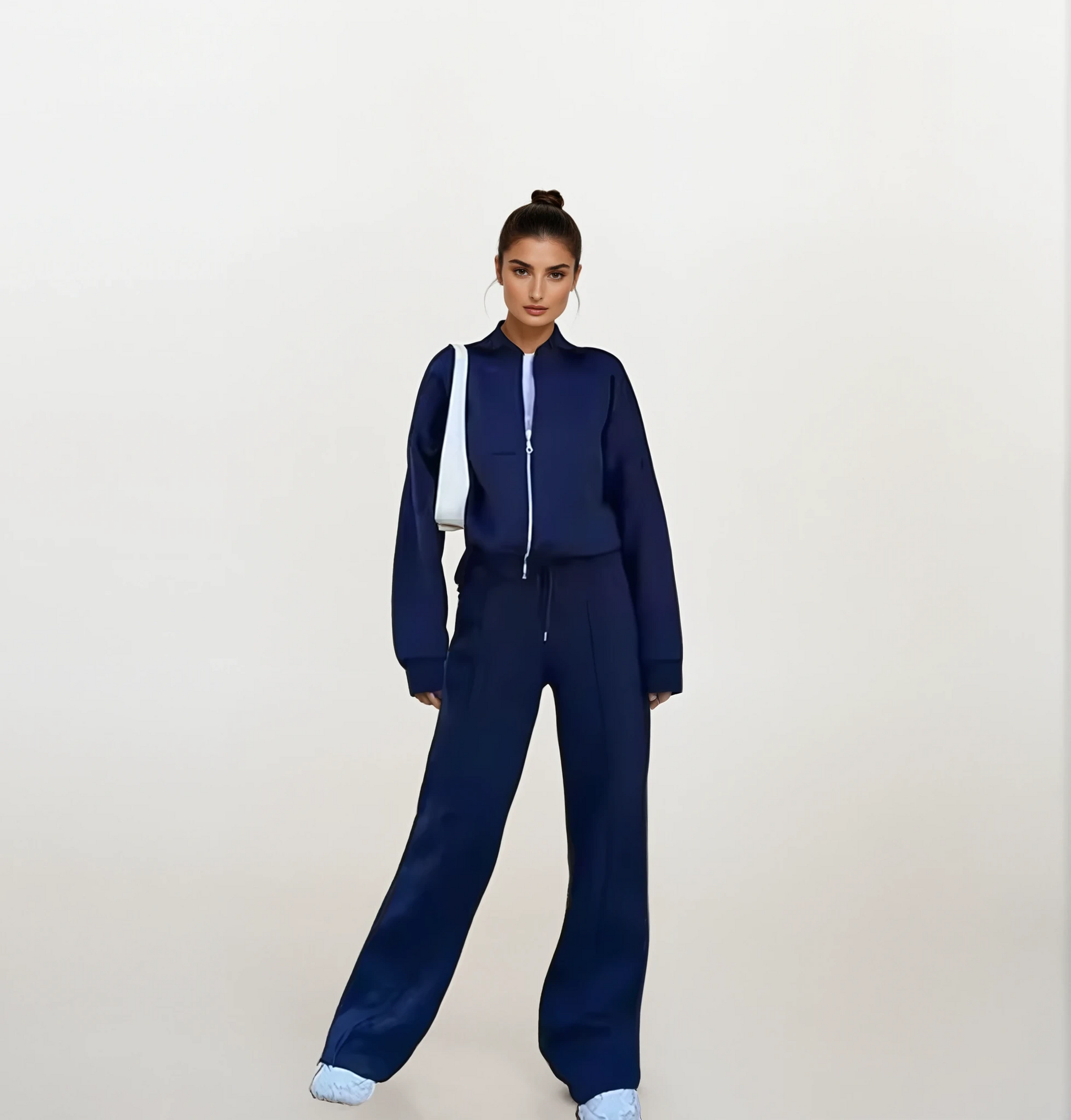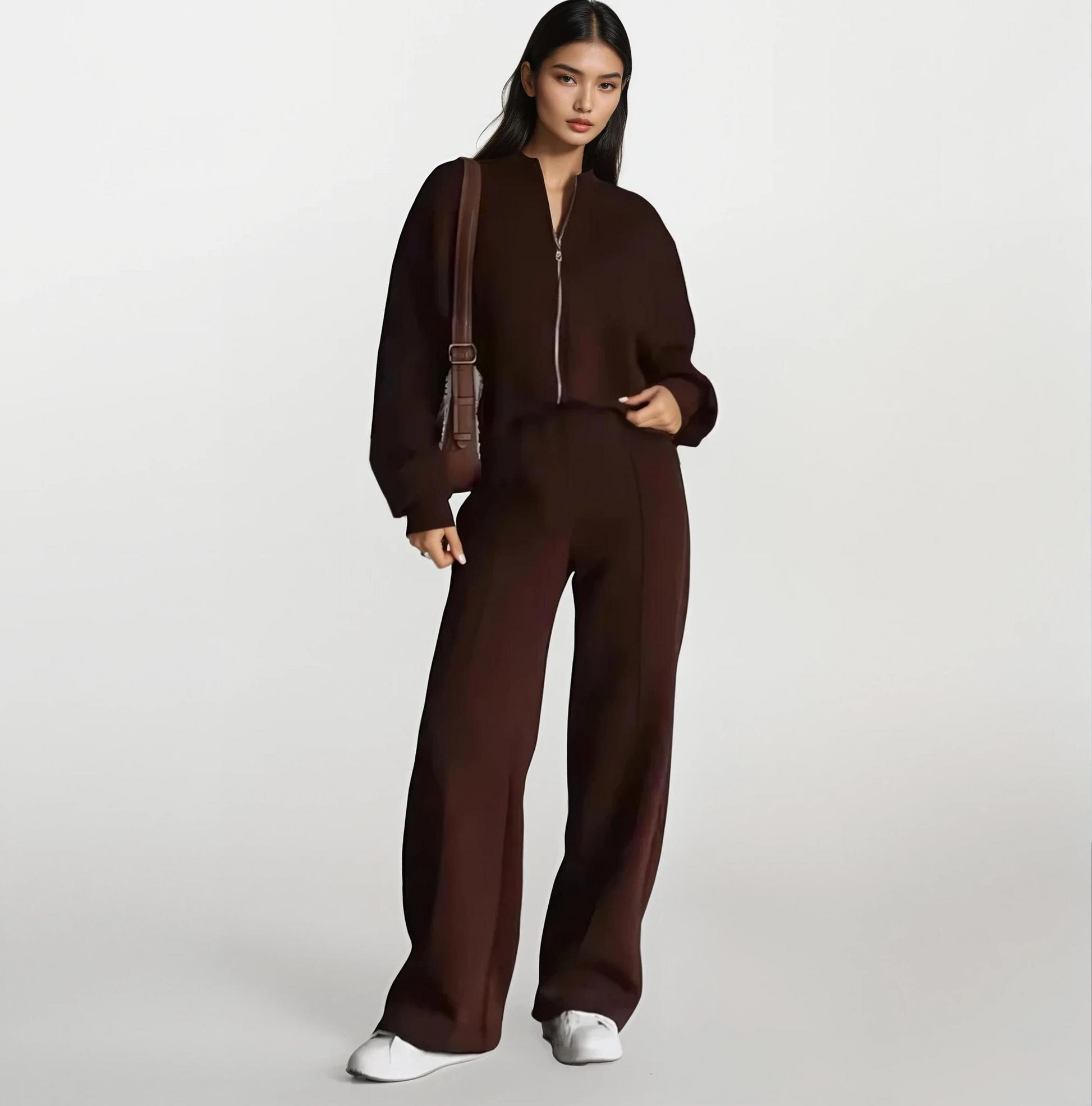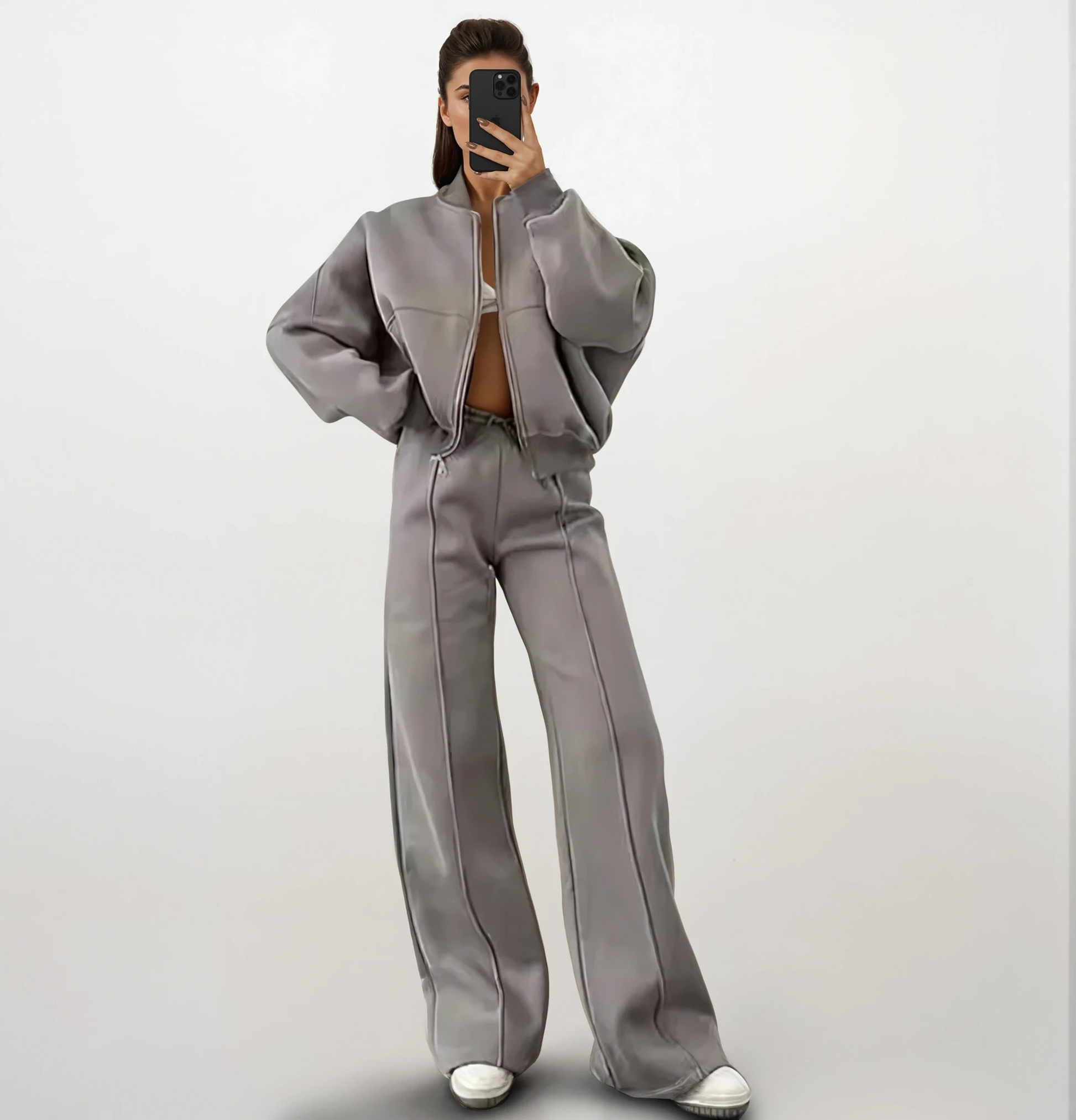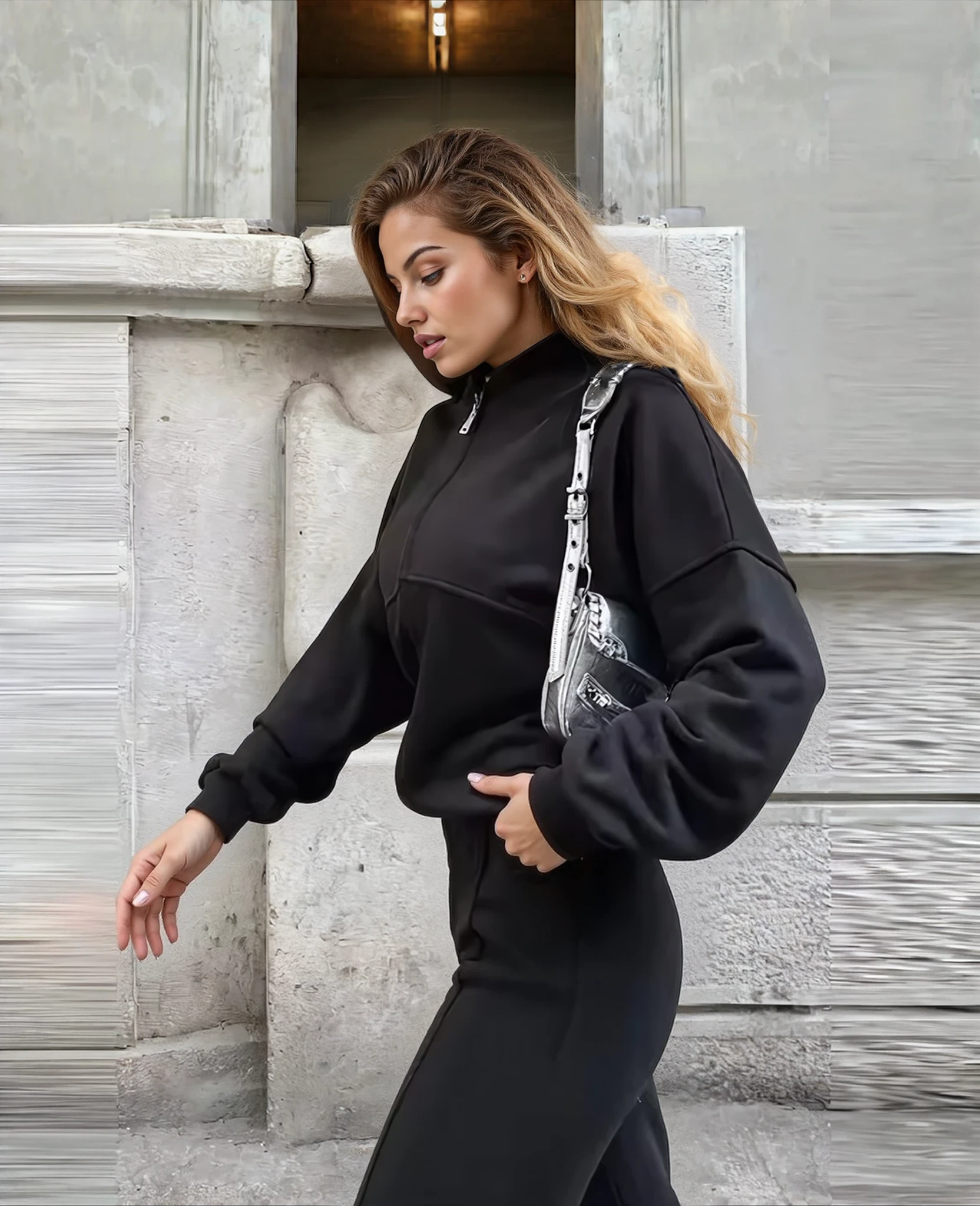 Håll dig elegant och bekväm med detta vår- och höstset med sweatshirtbyxor , designat för moderna kvinnor som älskar minimalistisk stil med vardaglig funktionalitet. Med en avslappnad O-ringad dragkedja och matchande lösa snörbyxor med resår i midjan, erbjuder denna tvådelade kostym andningsbar komfort, mjuk rörelsefrihet och mångsidig styling för vardagsbruk.
