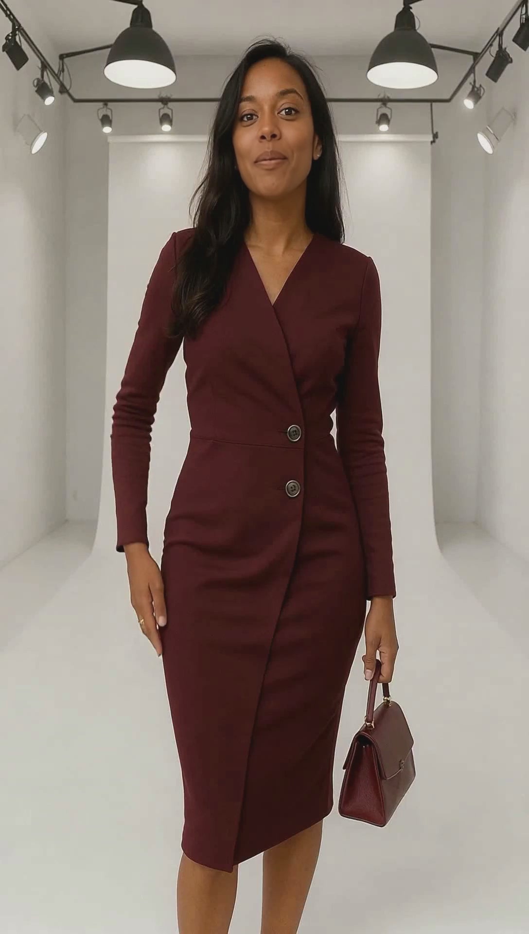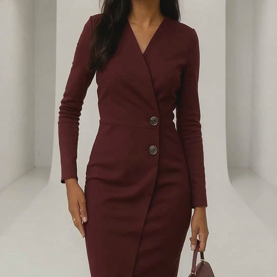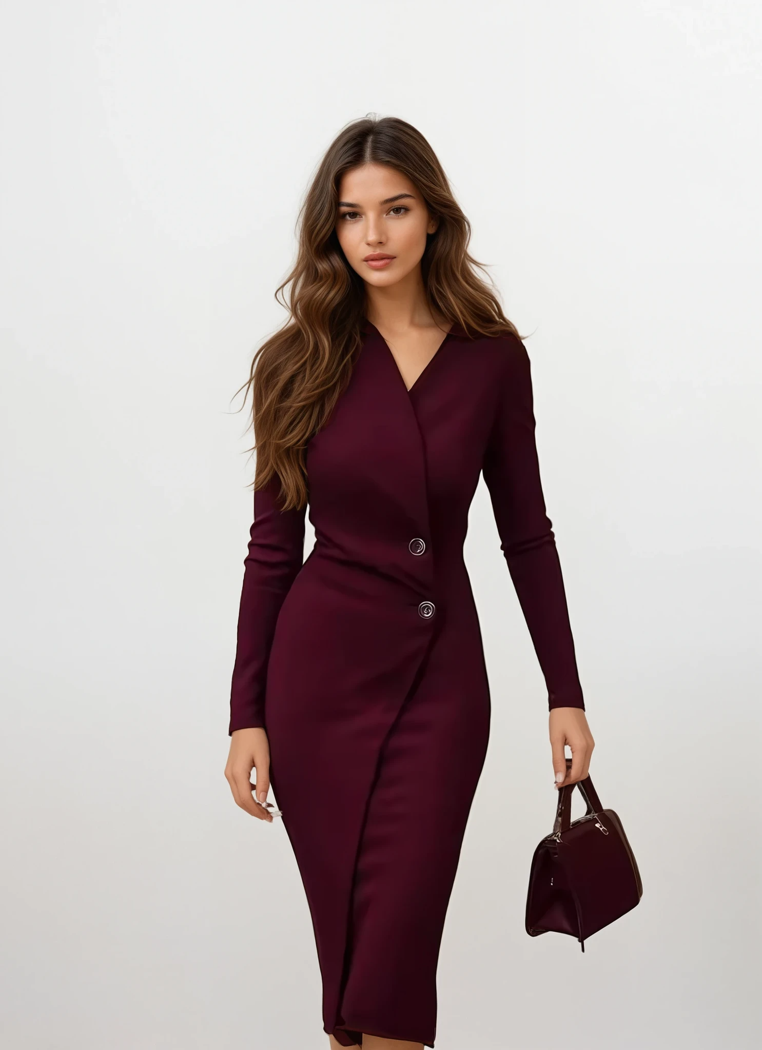Känn dig självsäker med vår eleganta, enfärgade midiklänning för kvinnor , designad för ambitiösa, modemedvetna kvinnor som vill se snygga ut utan att offra kvinnlighet. Denna enkelknäppta, v-ringade, långärmade klänning är den perfekta blandningen av sofistikering och modern stil, perfekt för kontoret, affärsmöten, formella evenemang eller alla tillfällen där du vill göra ett starkt intryck.