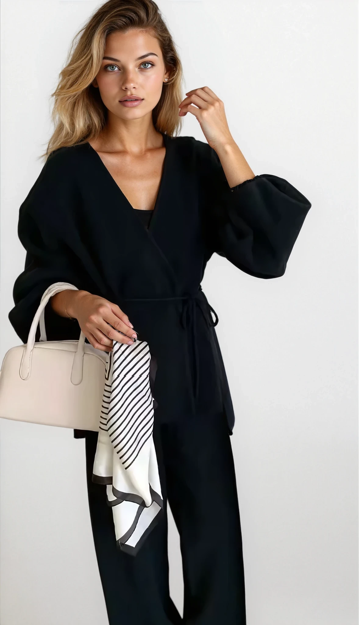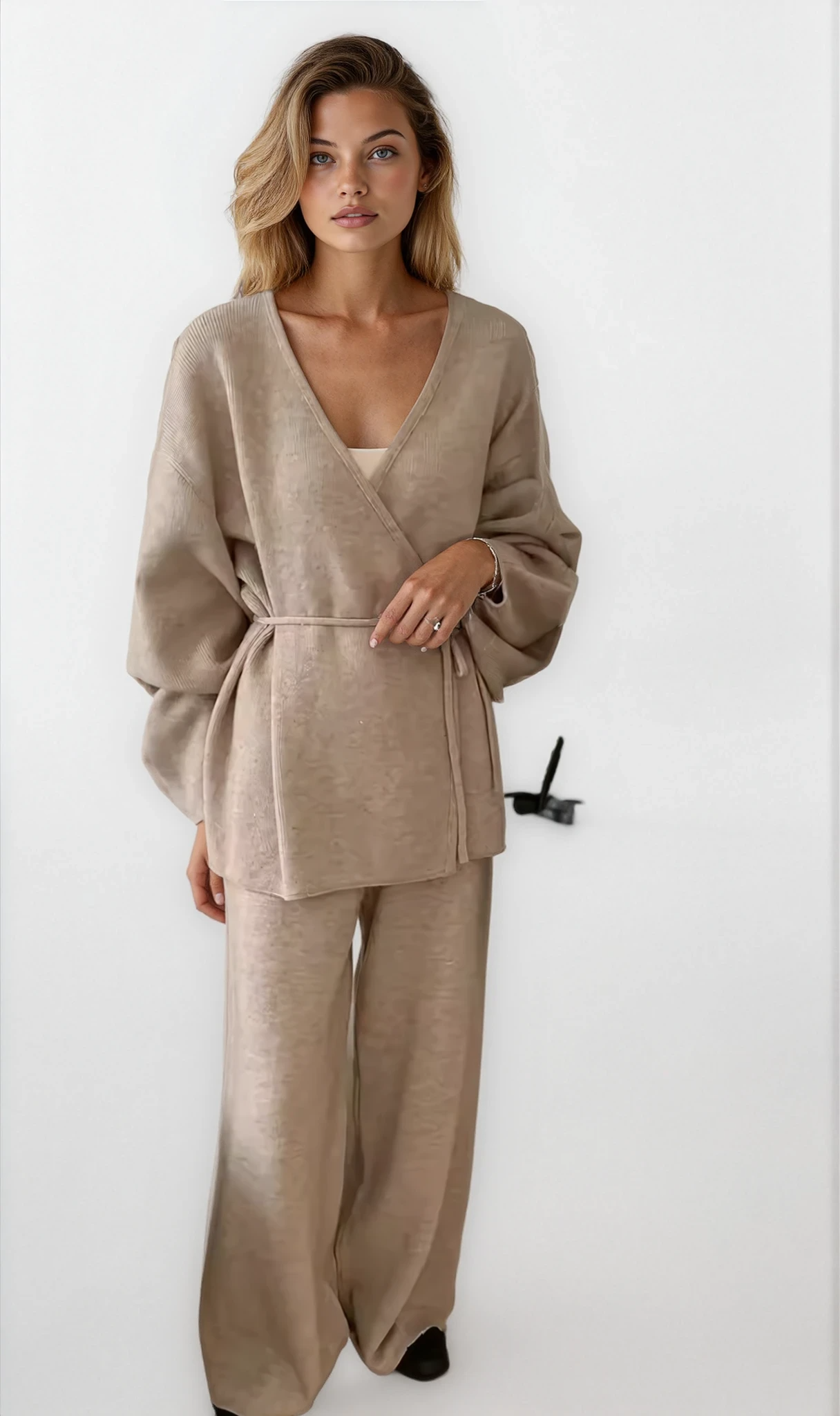 Snörkoftan ger en elegant feminin touch, medan det mjuka stickade tyget faller vackert mot kroppen, vilket gör den perfekt för vinterdagar, mysiga helger, hemmakontor, ärenden, brunchdejter eller avslappnade kvällar ute. De vida byxorna erbjuder andningsbar komfort och en modern silhuett som känns både avslappnad och elegant.