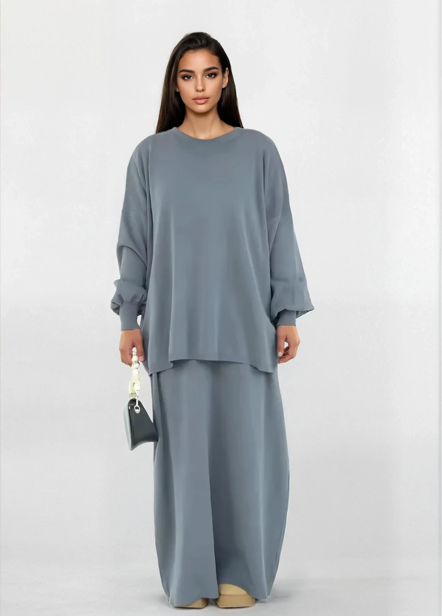 Inspirerad av Marockos och Dubais blygsamma modeestetik blandar denna tvådelade ensemble moderna stickade plagg med traditionell elegans. Den löst sittande tröjan erbjuder komfort och graciös täckning, medan den långa stickade kjolen ger rörelse och sofistikering – perfekt för Ramadankvällar, familjeevenemang och elegant blygsam klädsel under hösten och vintern.