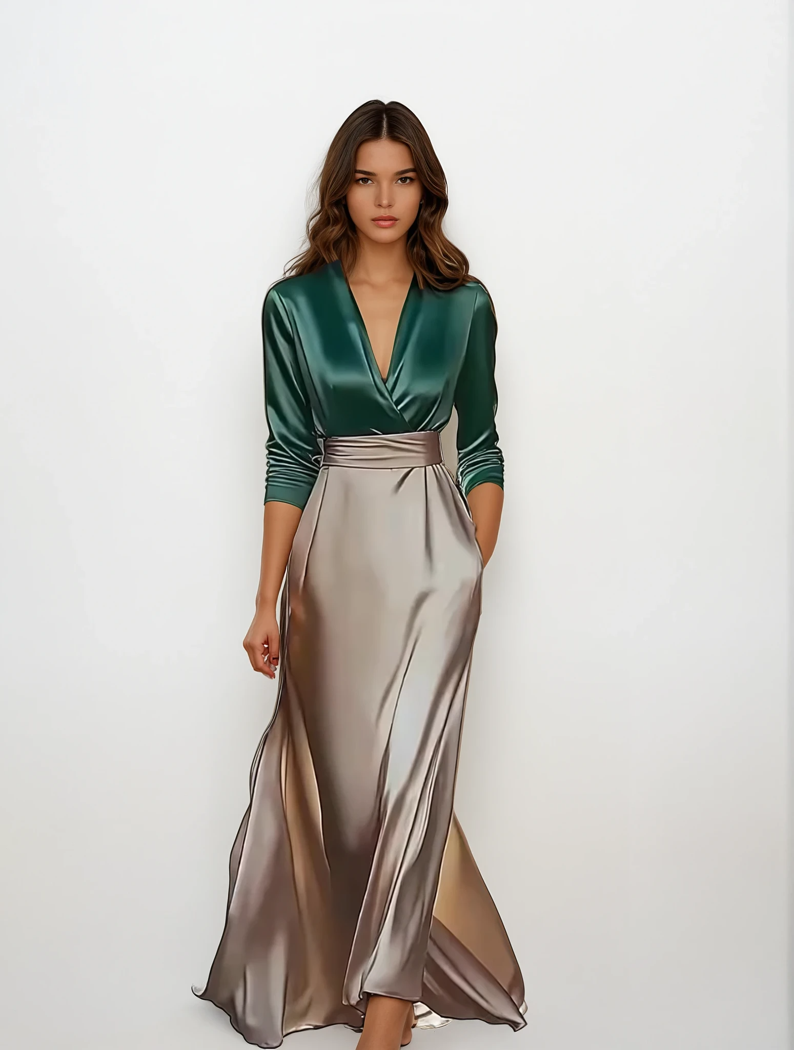 Den silkeslena långa kjolen flyter vackert med varje steg och skapar en avlång, feminin siluett, medan den mjuka chiffongblusen ger romantik och förfining genom sitt luftiga fall och smickrande V-ringning. Oavsett om den är stylad för en fest, middagsdejt eller en elegant vardagslook, ger detta matchande set ett polerat, sofistikerat utseende med minimal ansträngning.