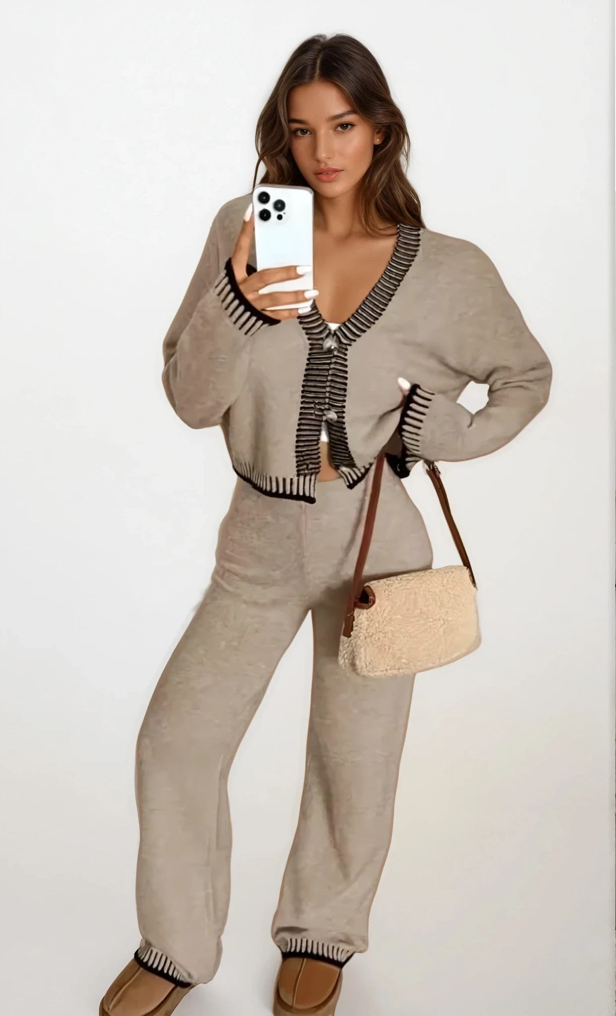 Kontraststickade detaljer ger djup och visuellt intresse, vilket gör att outfiten känns upphöjd utan att förlora sin avslappnade charm. Perfekt för hemmakontorsdagar, kaffeutflykter, resor, avslappnade kvällar eller avslappnad streetstyle, detta set ger värme, mjukhet och enkel rörelsefrihet samtidigt som det håller dig moderiktig.