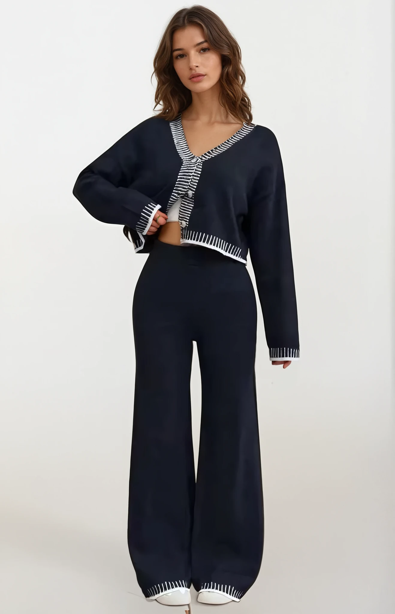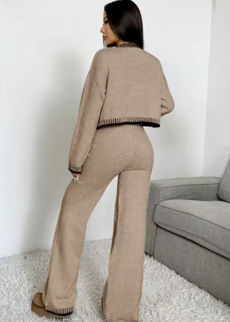 En snygg tvådelad outfit designad för avslappnad elegans under höst och vinter. Med en mjuk V-ringad kofta med knappar i kombination med avslappnade byxor med vida ben, blandar detta set komfort, struktur och modern minimalism i en elegant look.