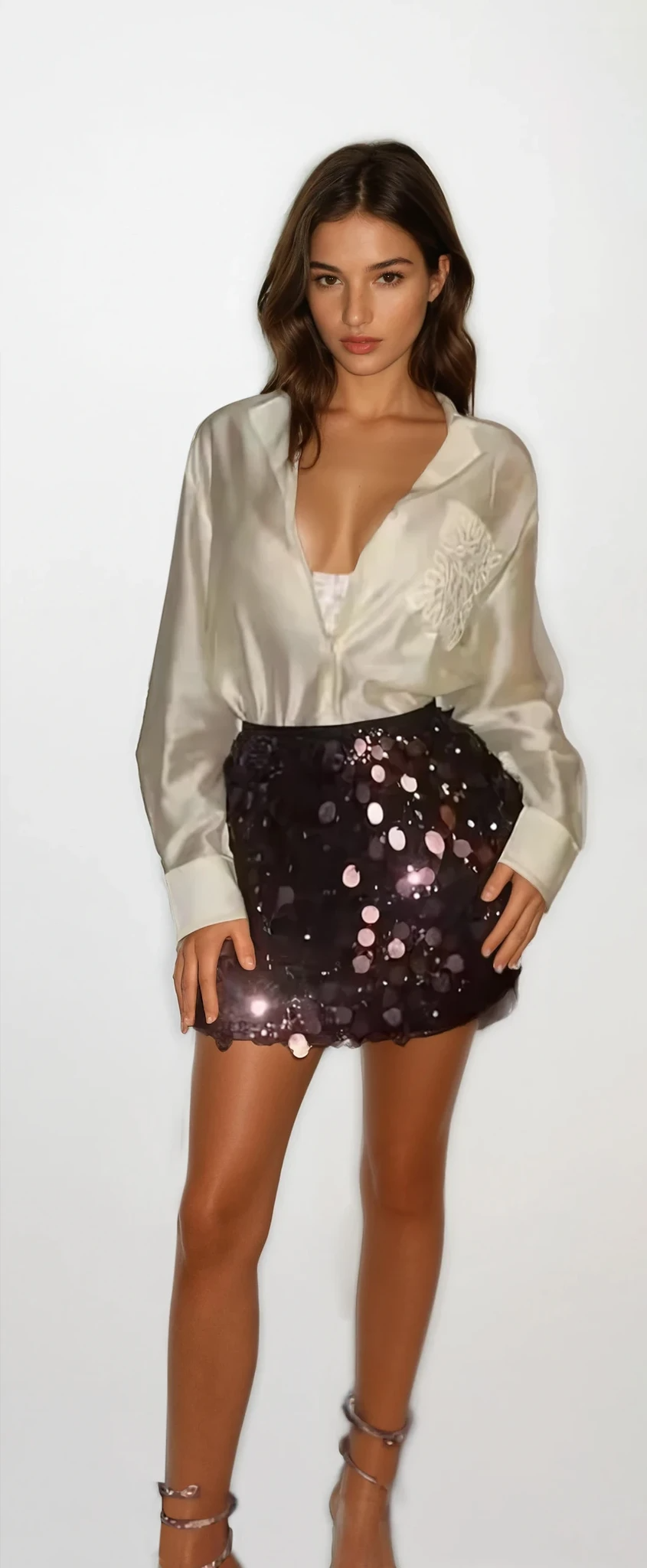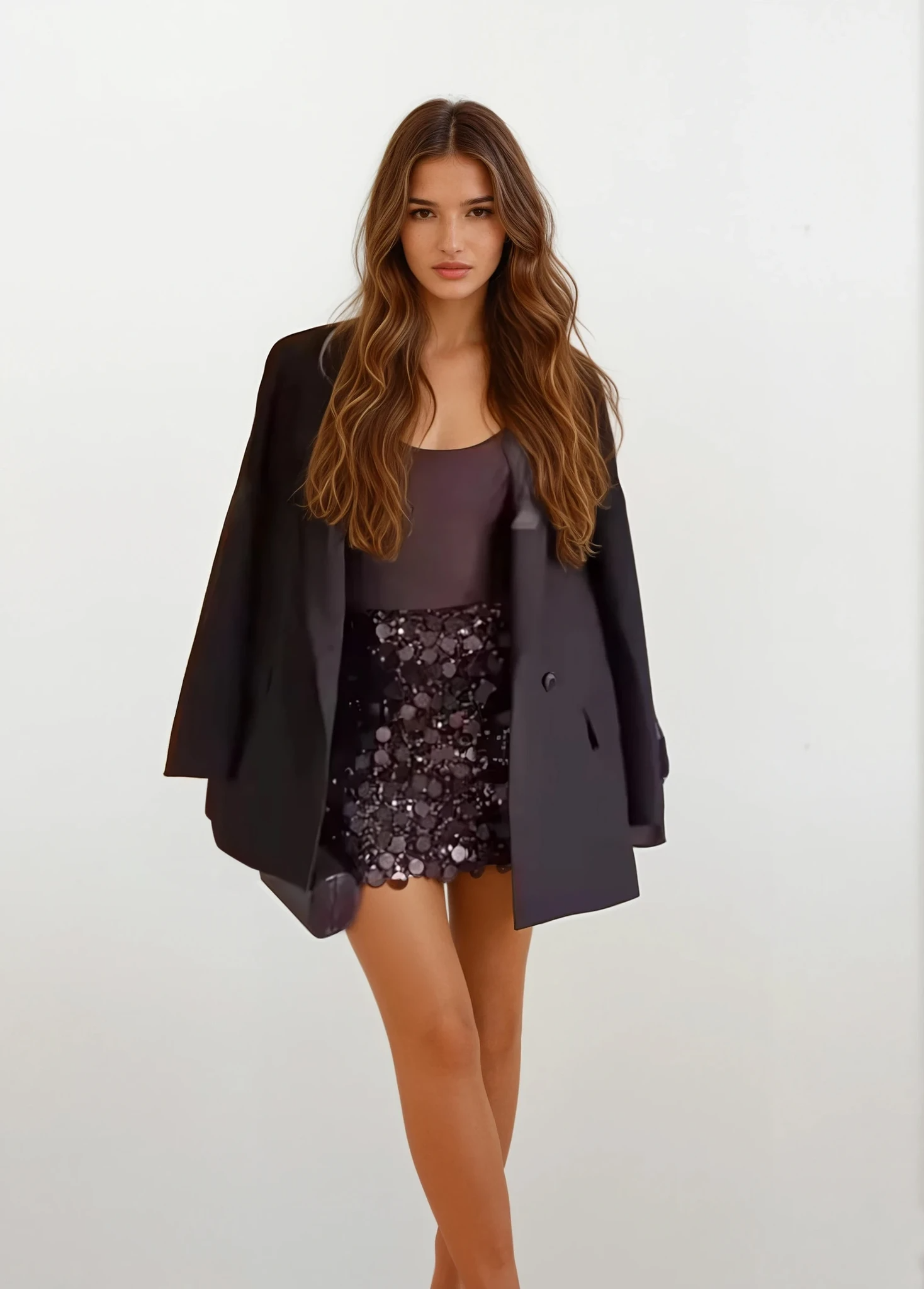 Förvandla varje fest till ett catwalk-ögonblick med denna sexiga mini-festklänning med paljetter , designad för kvinnor som älskar glitter, självförtroende och djärvt inspirerad glamour. Den höga midjan framhäver dina kurvor på alla rätt ställen, medan de skimrande paljetterna fångar varje ljus, vilket gör den till det perfekta iögonfallande plagget för julfester, nyårsafton, klubbkvällar och festliga kvällar.