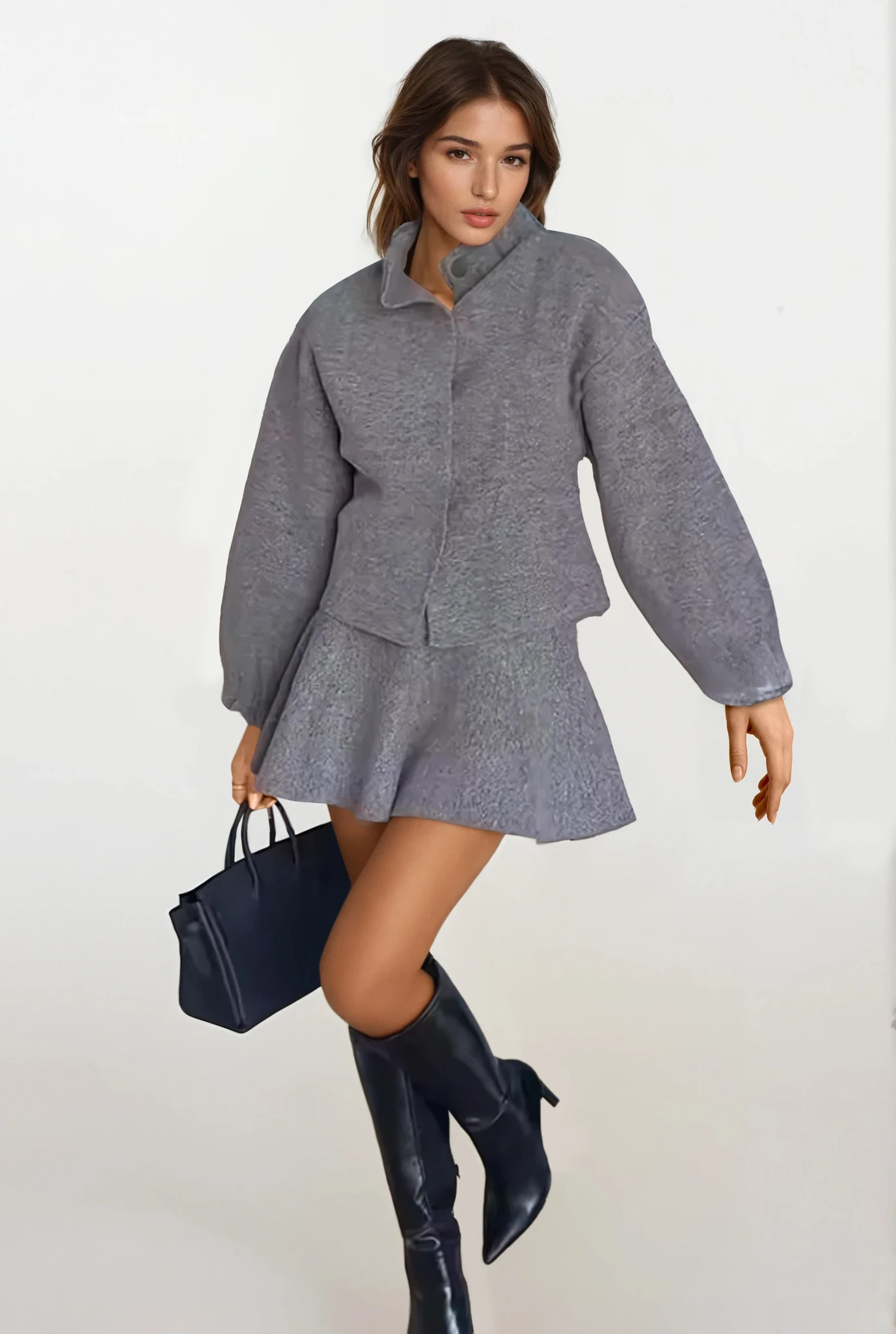 ⭐ Snygg tvådelad design: Den stickade toppen i bomberstil i kombination med en A-linjeformad minikjol skapar en balanserad och moderiktig silhuett.