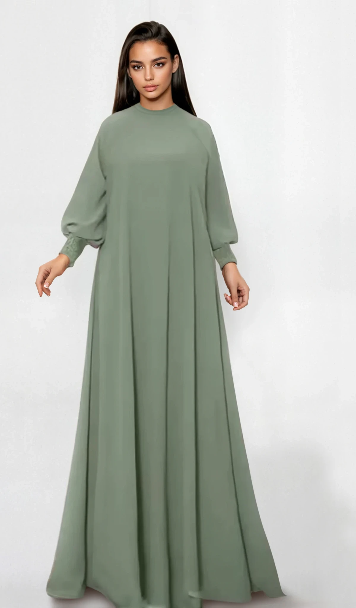 Dess långa, diskreta design och lätta rörelser gör den perfekt för sammankomster, middagar, firanden, bönevänlig klädsel eller elegant vardagsmode. Lätt att styla med halsdukar, hijabs, smycken, bälten eller koftor, denna maxiklänning anpassar sig sömlöst till personlig diskret stil samtidigt som den bibehåller en elegant och elegant look.