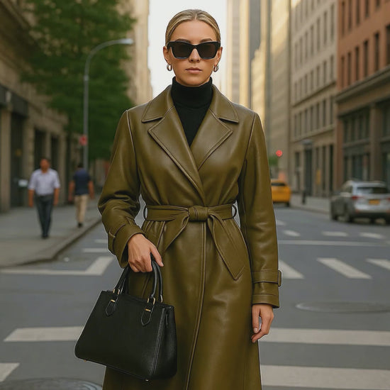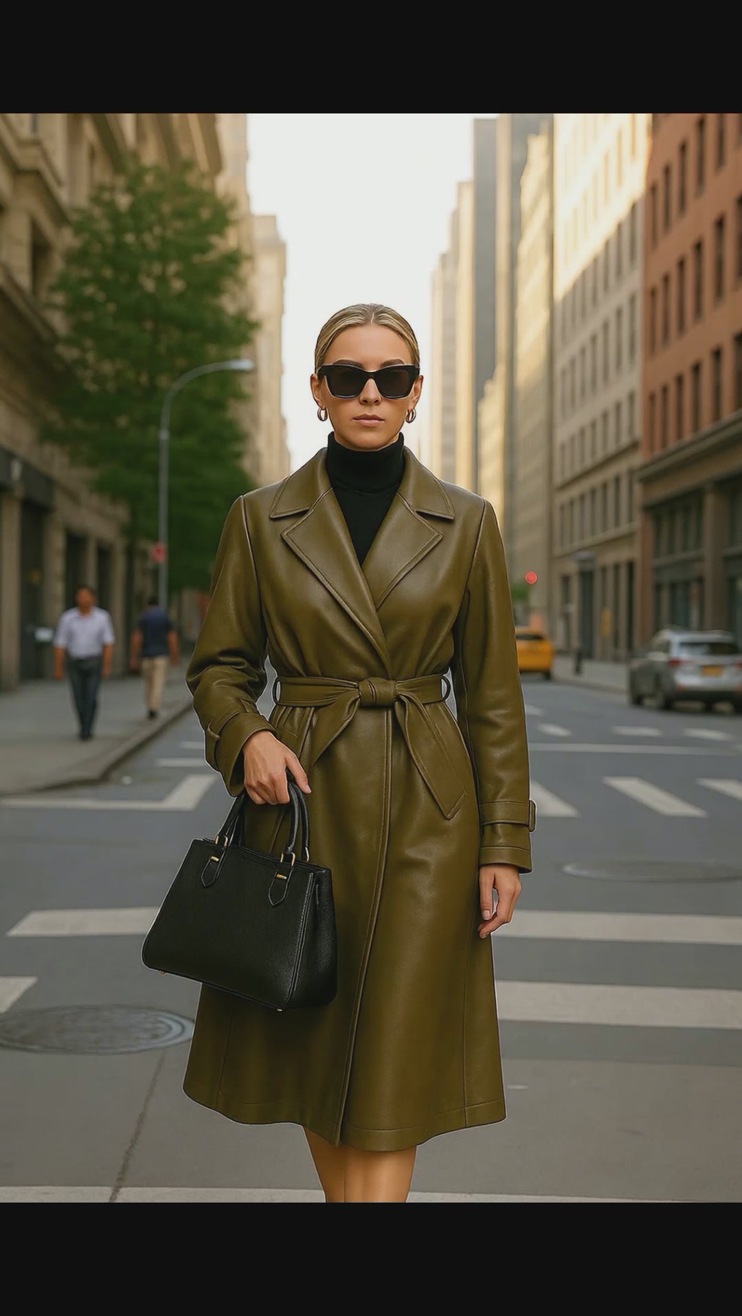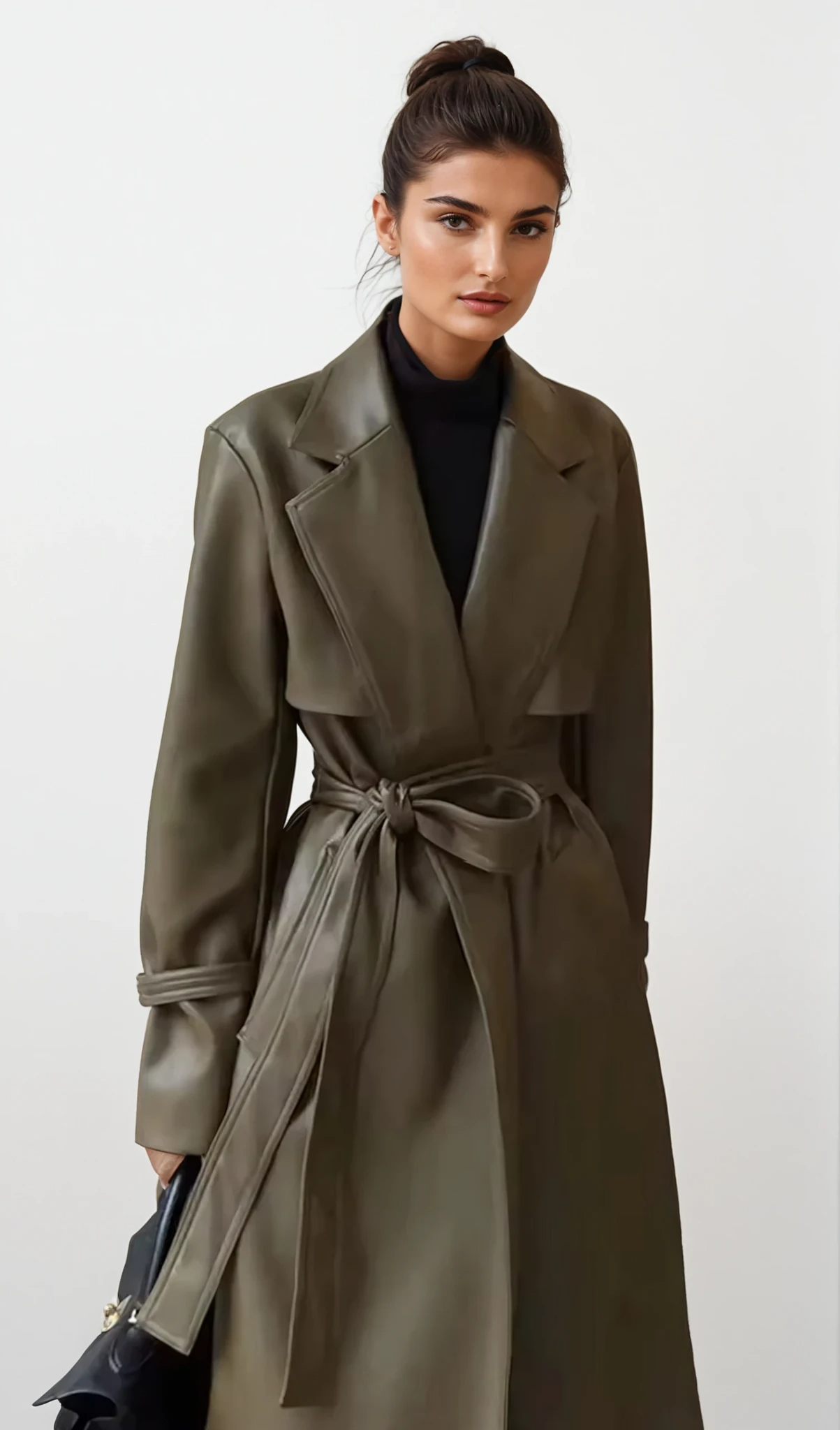 Förhöj din höstgarderob med denna överdimensionerade trenchcoat i konstläder , designad med en lång, böljande silhuett och en elegant glansig finish som omedelbart ger modern sofistikering. Det justerbara skärpbältet formar midjan samtidigt som det bibehåller det avslappnade fallet, vilket skapar ett djärvt men elegant ytterplagg perfekt för den modemedvetna kvinnan. Perfekt för lager-på-lager och sömlös vardagsstyling, denna trenchcoat förvandlar vilken outfit som helst med enkel finish.