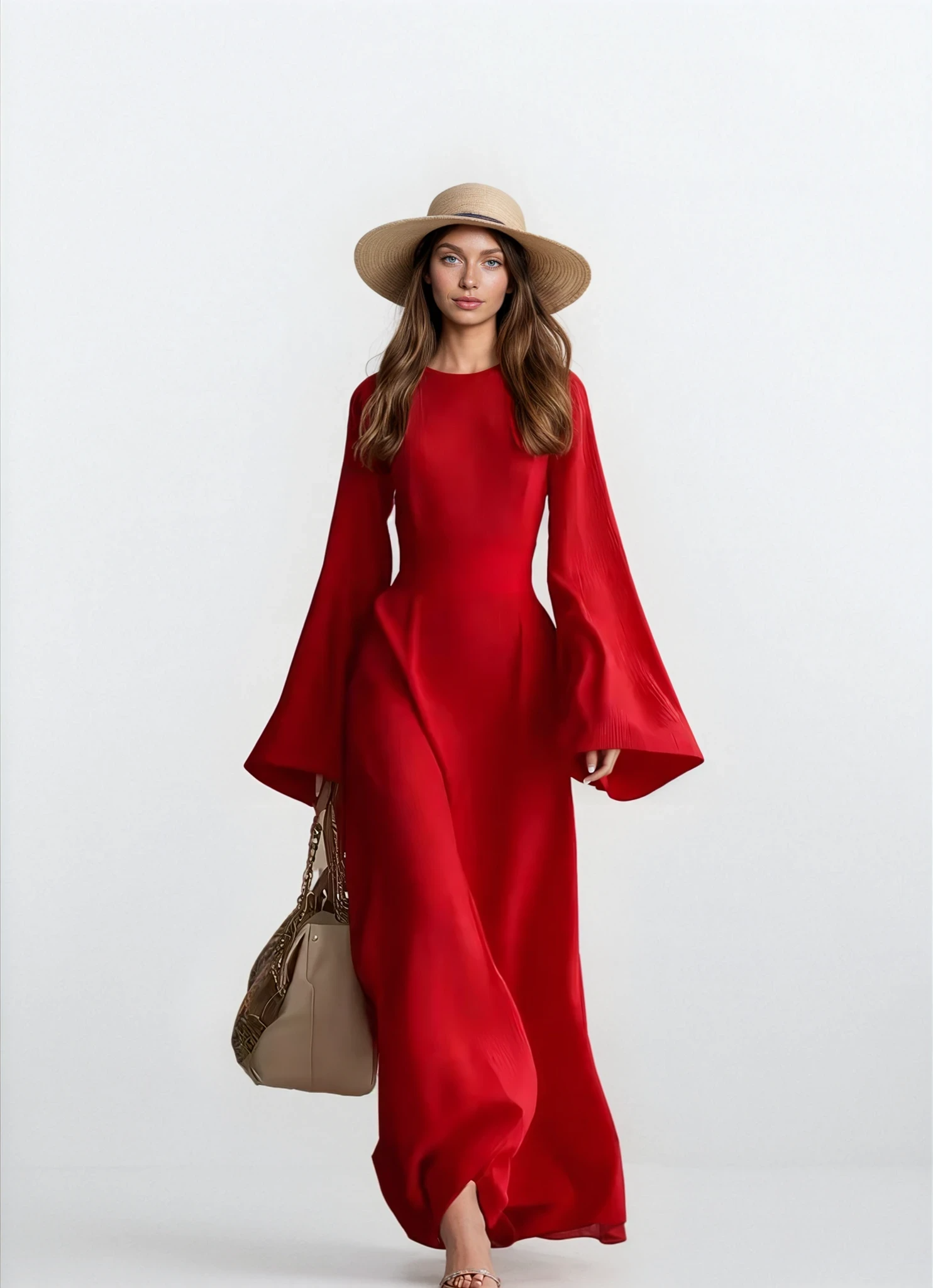Den solida minimalistiska designen ger den en tidlös touch, medan de subtila midjedetaljerna framhäver din naturliga siluett utan att kännas stram eller begränsande. De utsvängda ärmarna ger mjuk rörelse, vilket gör att klänningen känns både dramatisk och vackert bekväm. Oavsett om den stylas med klackar för kvällsglamour eller bärs avslappnat med platta skor eller stövlar, anpassar sig denna maxiklänning sömlöst till olika tillfällen.