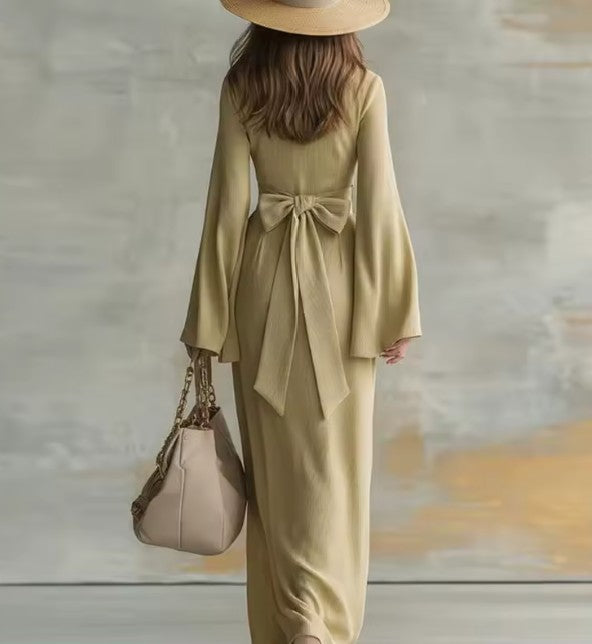 Kliv in i graciös sofistikering med denna eleganta rundhalsade maxiklänning , designad för moderna kvinnor som älskar feminin charm, komfort och mångsidig styling. Med en smal knytbar rosett i midjan, mjuka utsvängda ärmar och en böljande lång silhuett, erbjuder denna klänning en avslappnad romantisk elegans för vår, höst, middagar, evenemang och eleganta vardagsstunder.